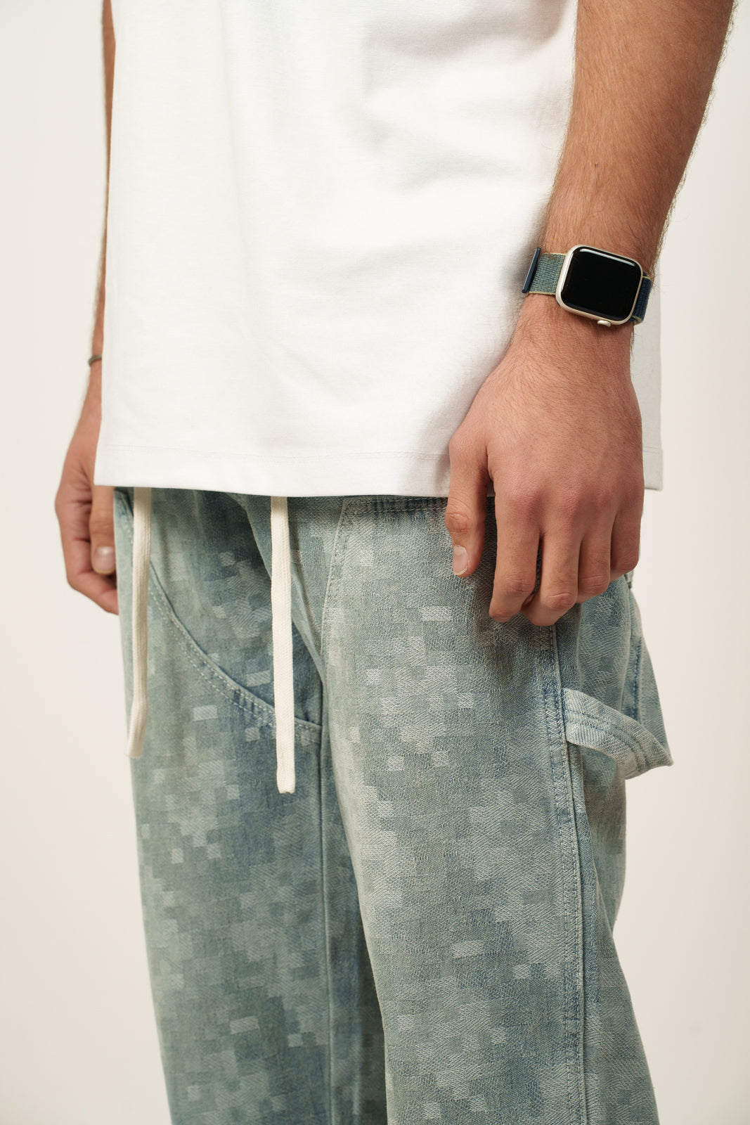 ג'ינס בגזרת אוברסייז בסגנון נגרים עם טקסטורה, גומי במותן, שני כיסים מקדימה, ושני כיסים מאחור.