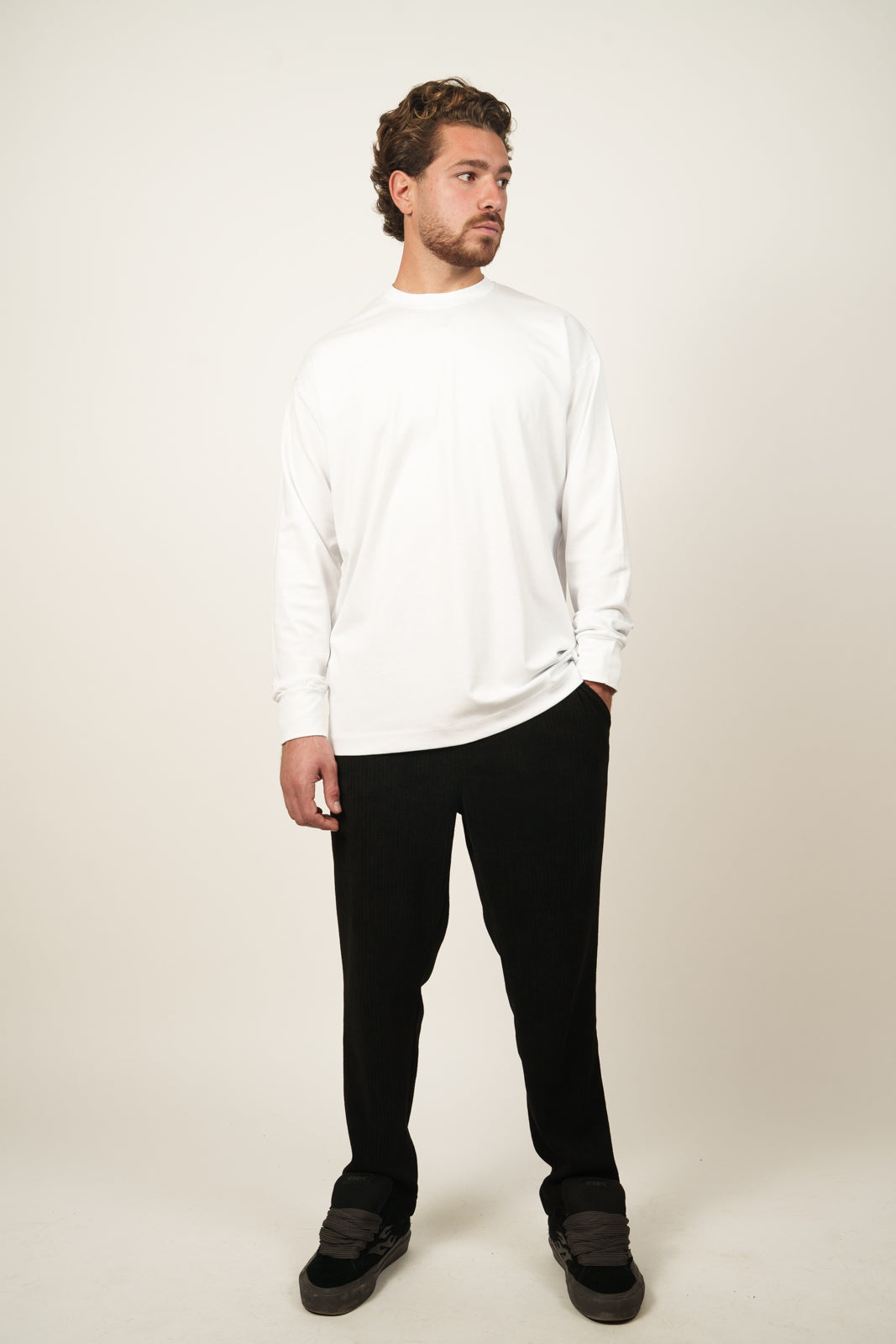 טי שירט בייסיק בגזרת אוברסייז עם צווארון עגול ושרוולים ארוכים.