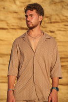 סט של חולצה עם סגירת כפתורים ושרוולים קצרים ומכנסיים קצרים בגזרת אוברסייז עם טקסטורה, גומי במותן וכיס מאחור.