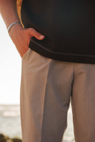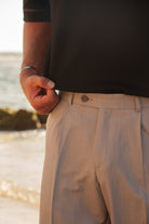מכנסיים בסגנון אלגנט עם פנסים, סגירת כפתור צידי, גומי במותן האחורי, שני כיסים מקדימה ושני כיסים מאחור.