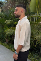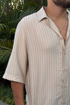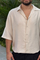 חולצה מכופתרת בטקסטורת פשתן, סגירת כפתורים ושרוולים קצרים.